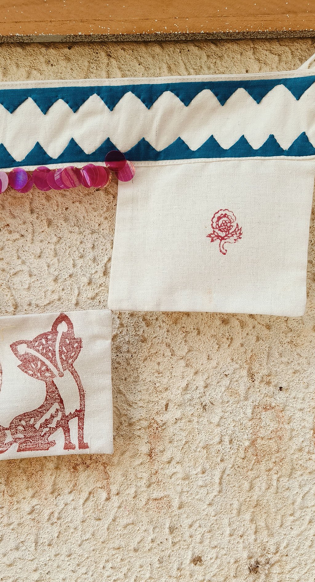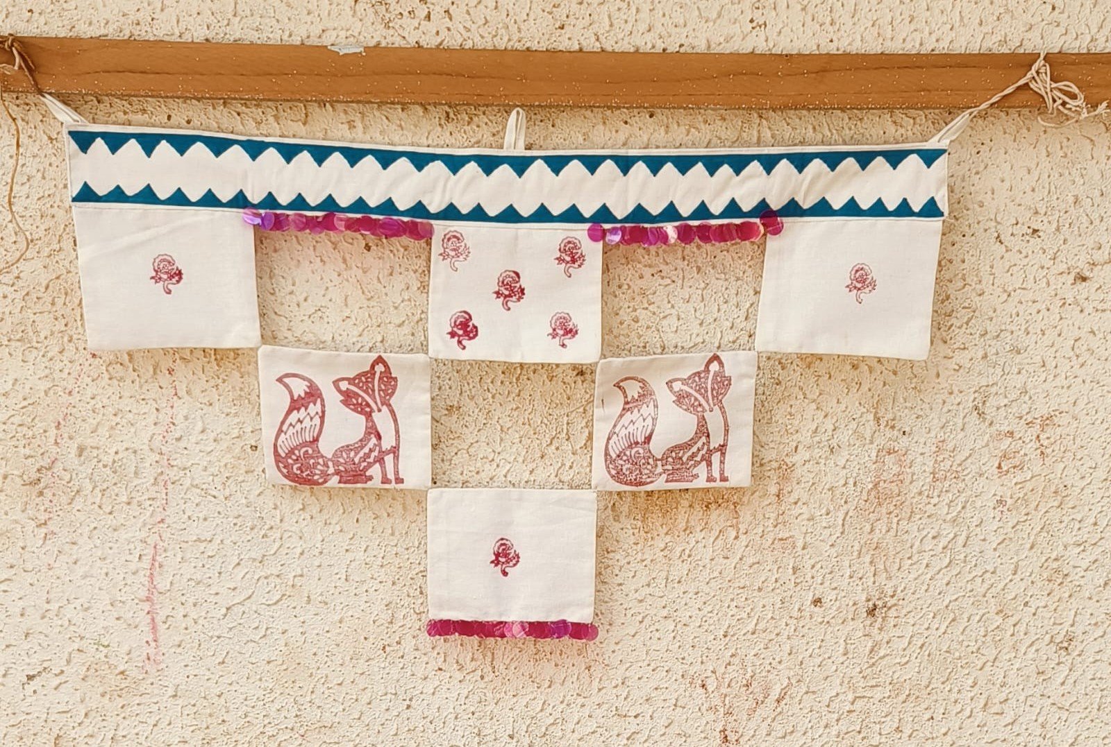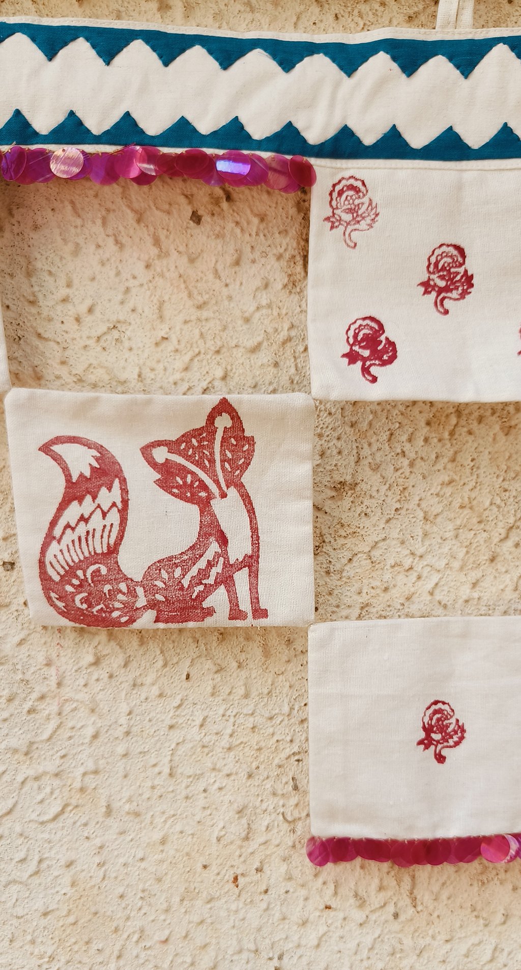 Printed with designs of fox and tiny rose on white, this wall hanging is a mix of contemporary and traditional concepts, finished with sequins and a blue applique temple border.